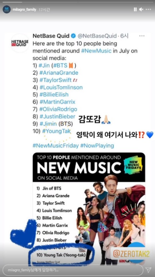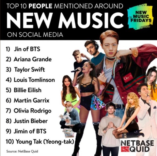 BTSはもちろん、アリアナグランデ、テイラー・スウィフト、ビリーアイルリ時などそうそうたる歌手らが名を連ねた中でヨンタクがTOP 10に名を連ねて目を引く。