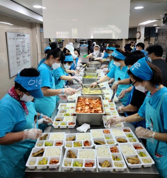 英雄時代のバンド(分割会)のメンバーは、コロナ19の拡散による政府防疫指針に基づいて、猛暑の中でもマスクと手を消毒ティッシュ、衛生手袋を着用しお弁当伝達奉仕に出た。