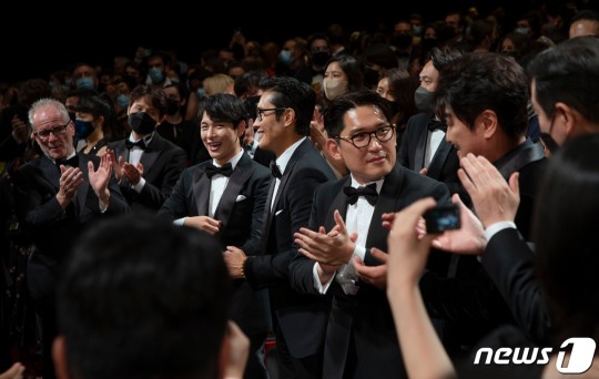 (カーン=ニュース1)イジュンソンフリーランスの記者=16日午後(現地時間)、カンヌ国際映画祭が開かれている南フランスのリゾート地カンヌパレデフェスティバルグランリュミエール劇場でハン・ジェリム監督の「緊急宣言」上映終了後に出席したハン・ジェリム監督とソン・ガンホ、イ・ビョンホン、一時ワン観客たちの拍手喝采を受けている。 2021.07.17/ニュース1。