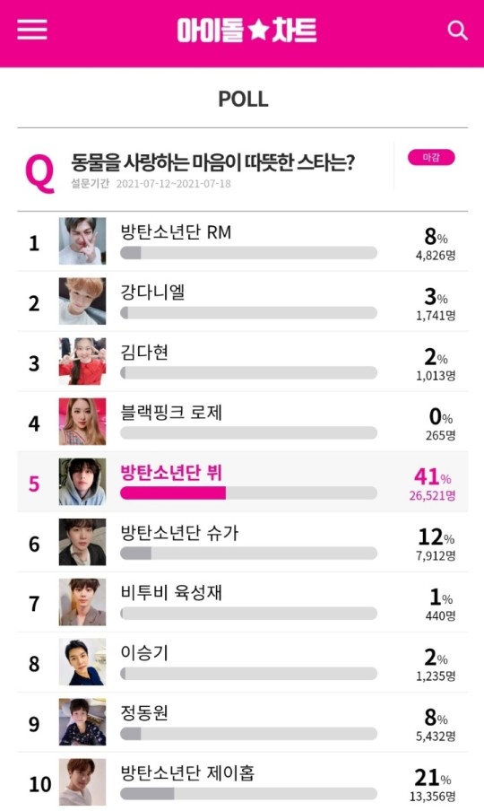 ヴィは、7月12日から18日までのアイドルチャートで行われた「動物を愛する心が暖かいスター」投票で2万6521票を獲得し、41%の得票率を記録して1位に上がった。