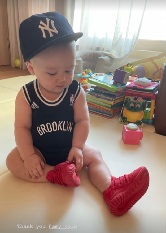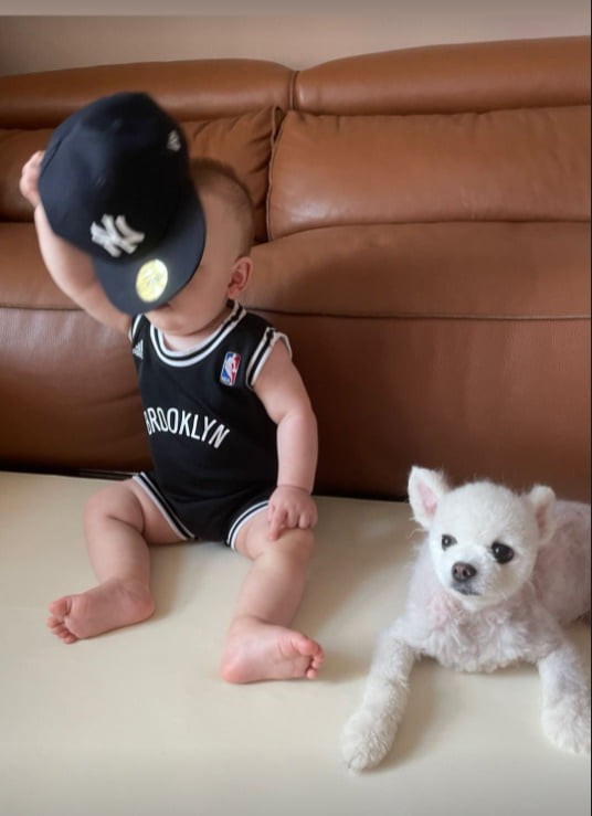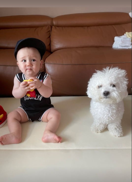 公開された写真の中にさゆりの息子ジェン帽子をかぶって普段着をし、犬の横に並んで座っておもちゃに触れている。