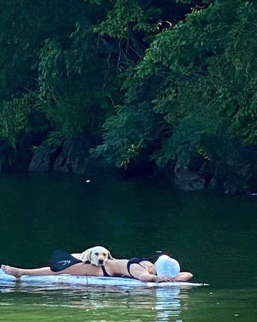 彼は黒ビキニを着て大型犬と一緒に悠々自適に楽しんでおり、視線を集める。