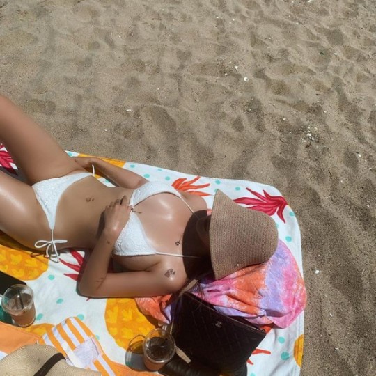 波形の絵文字を短く文を残したLEは、砂浜の上に横になって日焼けしている姿を公開した。白いビキニを着たLEは、帽子で顔を隠したまま熱い太陽に身を乗せている。