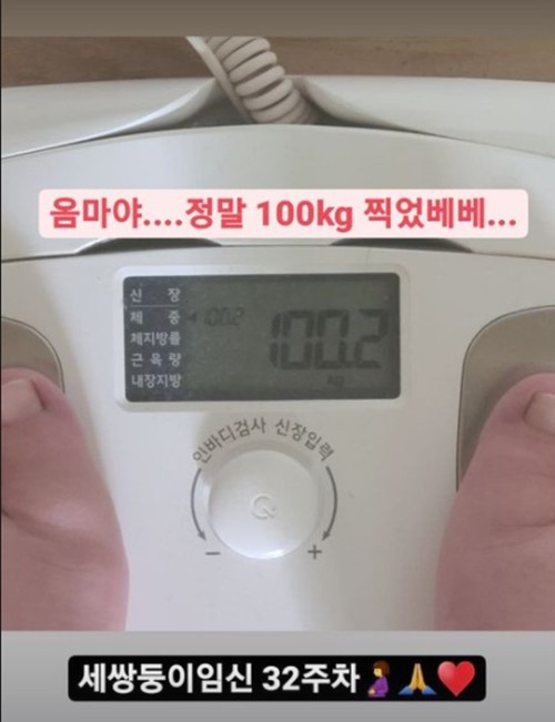 コメディアンファンシンヨウンが出産を控えて近況を公開した./写真=ファンシンヨウンインスタグラム公開された写真には、100.2kgが押された体重計の姿が入れられた。三つ子を妊娠、臨月になったファンシンヨウンの体重を知ることができる場面だ。
