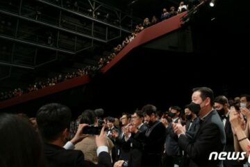 (カーン=ニュース1)イジュンソンフリーランスの記者=16日午後(現地時間)、カンヌ国際映画祭が開かれている南フランスのリゾート地カンヌパレデフェスティバルグランリュミエール劇場でハン・ジェリム監督の「緊急宣言」上映終了後参加したハン・ジェリム監督とソン・ガンホ、イ・ビョンホン、一時ワン観客たちの拍手喝采を受けている。 2021.07.17/ニュース1。
